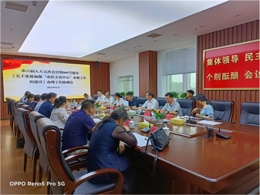 6月3日,在市城投集团9楼会议室召开第69号建议关于重视加强“市民文化中心”布展工作的建议的协商会议,会议由市政府副秘书长桂培廷主持,市人大代表杨光辉、夏太平以及市政府办、市自然资源和规划局、市文旅广体局、团市委、市总工会、市红十字会、“一园两中心”建设指挥部、市科协、市老干局、市妇联等相关单位同志共同参加。