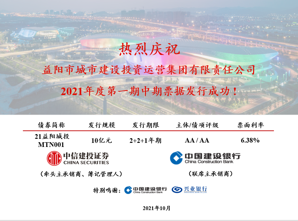 2021年10月27日,由益阳城投集团作为发行主体,中信建投、建设银行作为主承销商的“益阳市城市建设投资运营集团有限责任公司2021年度第一期中期票据”在中国银行间交易商协会成功发行,发行规模10亿元,期限2+2+1年期,票面利率6.38%。此次债券是益阳城投集团在交易商协会发行的第一只公募债券,也是自2020年我司转型以来发行的首支债券。