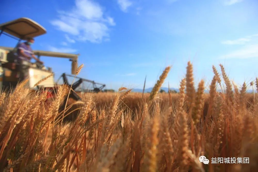 △收割机在山东省临沂市平邑县的麦田里收割小麦(2021年6月8日摄)。